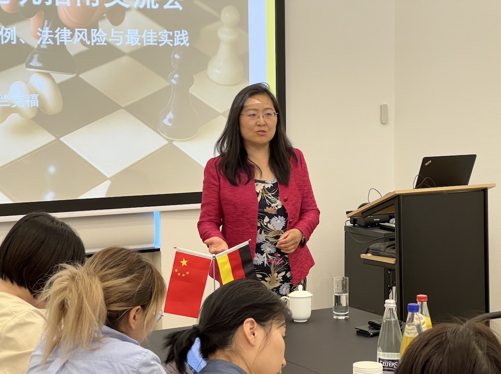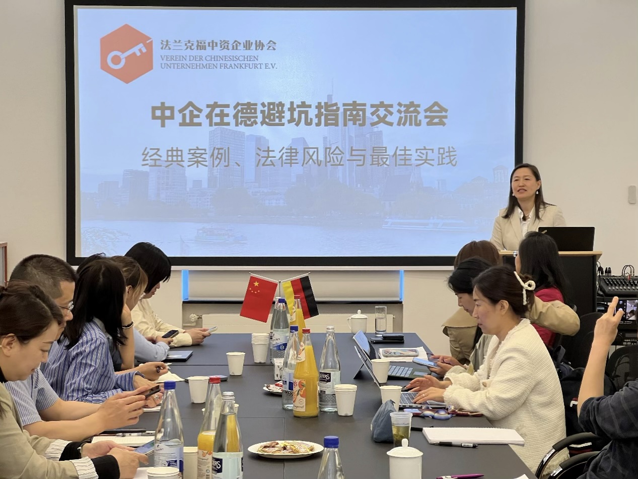 2025年5月15日,法兰克福中资企业协会成功举办了一场主题为“中企在德避坑指南交流会:经典案例、法律风险与最佳实践”的专题法律讲座。此次讲座主要为帮助在德中资企业更好地理解和应对德国的法律环境,活动吸引了会员单位20余名代表参加,讲座由协会秘书长、中国贸促会驻德国代表处代表房芳主持,主讲嘉宾为德国执业律师张宁女士,张律师在德从事法律工作多年,具备丰富法律服务经验,语言精准,讲解深入浅出。