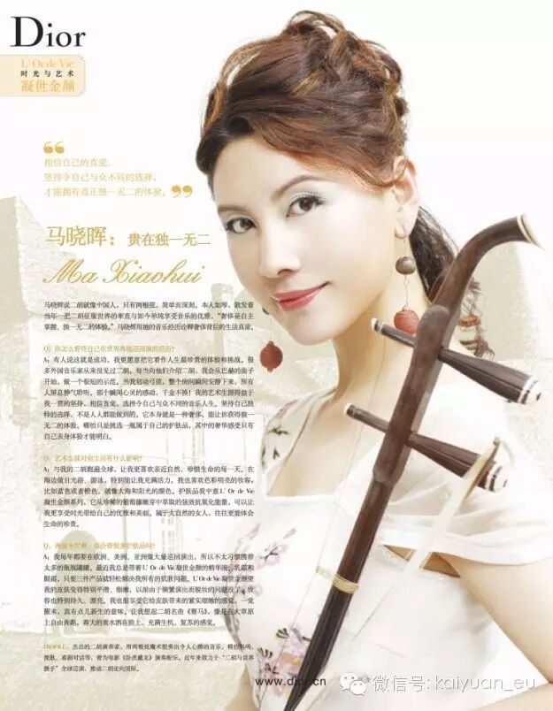 法国著名品牌“Dior”,2008年首次启用亚洲艺术家作为他们的品牌代言人。马晓辉更是作为第一位中国器乐演奏家与她心爱的二胡一起,成为该品牌的形象代言。也更证明了在过去的15年中,马晓辉“在路上”全球巡演的文化渗透力及深厚影响力。