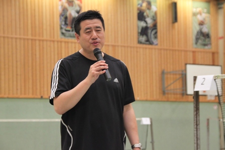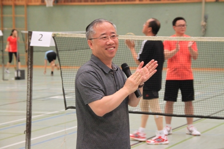 驻法兰克福总领馆总领事梁建全,法兰克福中资企业协会主席陈飞分别致辞,梁总领对此比赛的组织安排深表满意,他指出比赛是本着友谊第一,比赛第二的原则,以增进协会会员企业之间的互动和丰富法兰克福领区华人文体活动,增强凝聚力为目标,最后他衷心的预祝比赛活动顺利进行。陈飞主席在致辞中感谢各会员企业对本次活动的积极参与,自第一届比赛以来羽毛球运动深受大家的喜爱,协会将会把这个活动项目一直进行下去,丰富企业员工及家属的业余生活,起到强身健体的目的。新任驻法兰克福总领馆经商室朱伟革参赞携家人以及徐琳领事也亲临了比赛现场。