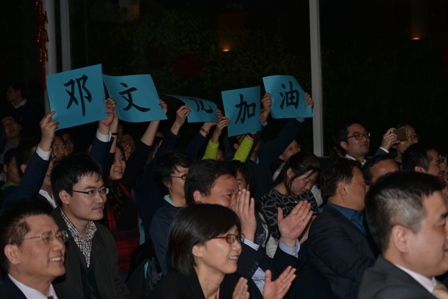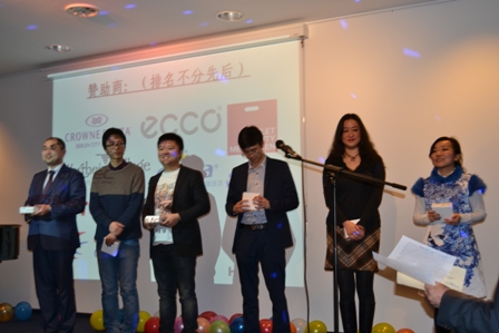 紧接着是中国农业银行法兰克福分行的邓文龙歌舞组合《龙的传人》,场下观众纷纷打出牌子,为心仪的歌手加油助威,气氛很快到达高潮;