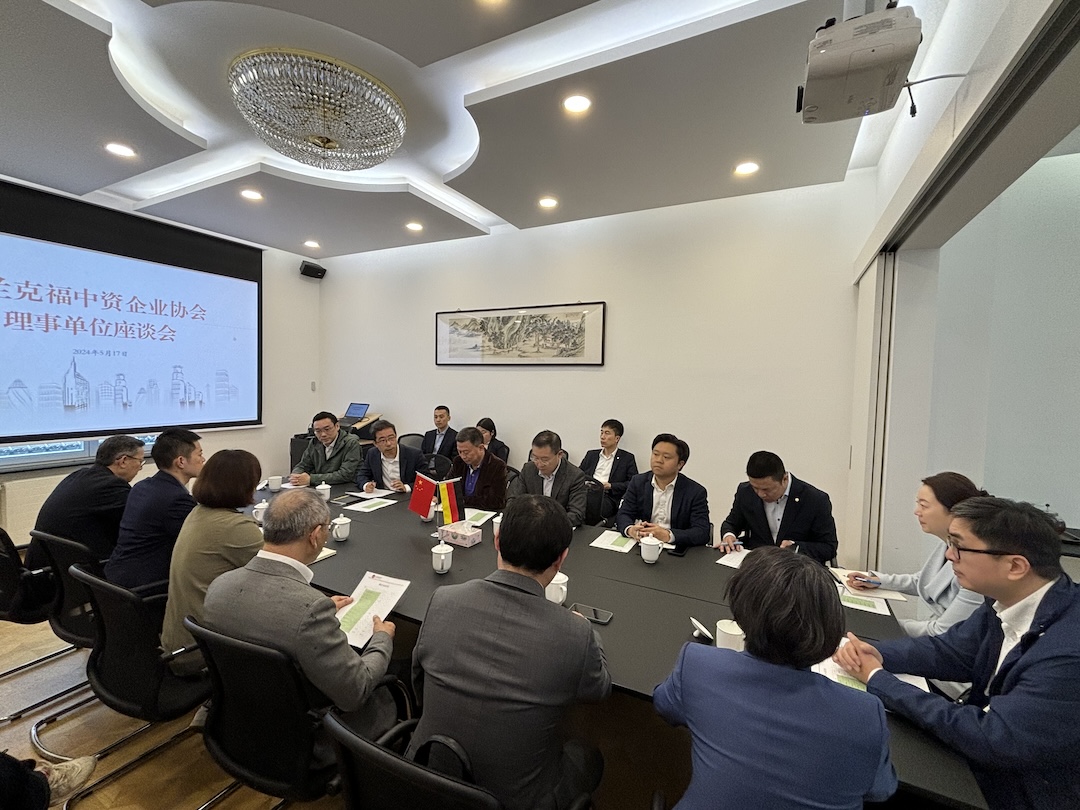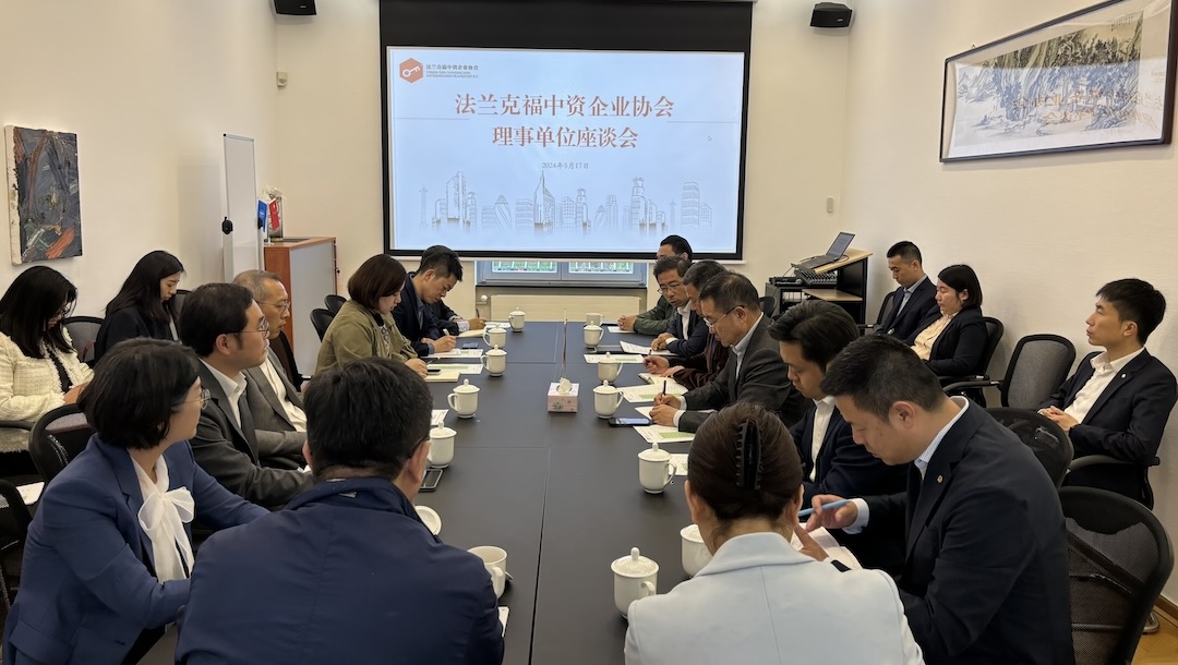 2024年5月17日下午,法兰克福中资企业协会举办理事单位座谈会,来自13家理事单位的近20名代表到场参会。本次会议由协会秘书长、中国贸促会驻德国代表处总代表洪锡国主持,驻法兰克福总领馆经商处陈岩主任出席会议并讲话。
