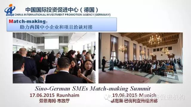 Match-making/对接:助力两国中小企业和项目对接洽谈。今年6月,我们会同佛山中德工业服务区分别在劳恩海姆和慕尼黑等地组织了两场中德中小企业对接会,参与对接企业超过200家。同时,发挥商务部项目资源库的信息汇聚作用,发布和对接了中小企业合作项目。此外,正在积极组织德国机构和企业中国行,精心组织和带领德方机构和企业考察园区和对接企业。