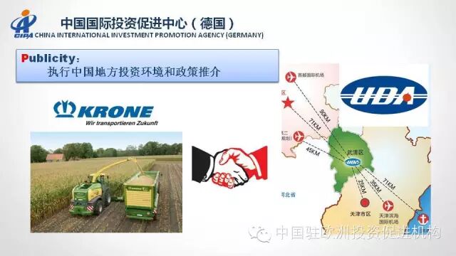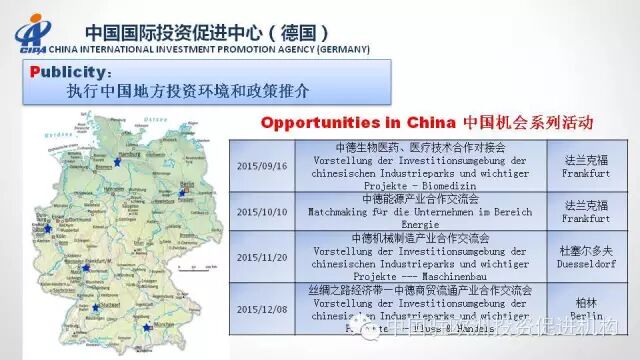 Publicity/推介:执行中国地方投资环境和政策推介。让德国企业了解中国,投资中国,做好“引进来”工作一直是我们的工作重点。为推动中国省市园区在德投资合作的开展,高效地聚拢德方企业和项目资源,服务两国中小企业在各产业领域的对接交流,策划了“中国机会-中国园区投资环境推介和重点项目宣讲系列活动”,9月开始,已成功举办了生物医药、能源产业的双边交流活动,为中方园区、中资企业提供更多的在德展现,对德发声机会。