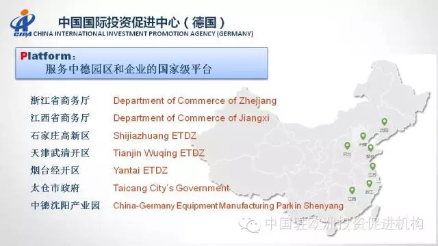 Platform/平台:服务中德园区和企业的国家级平台。在德投资促进平台建设上,我们邀请了浙江省商务厅、江西省商务厅、石家庄高新区、天津武清开发区、烟台开发区、太仓市政府、中德沈阳装备制造产业园参与在德共建或合作,抱团取暖。同时,积极探讨发起和设立中德投资促进合作机制,加强与德方各层面的投资促进机构、工商会和企业形成紧密的联络机制。