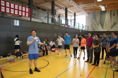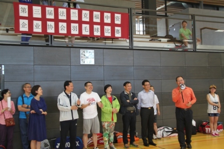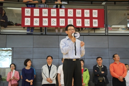 驻法兰克福总领馆总领事王顺卿,中国银行法兰克福分行行长、法兰克福中资企业协会主席李光分别为本届比赛致辞。王总领事在致辞中叮嘱大家友谊第一、安全第 一、娱乐第一、比赛第二,要以增进各企业之间的互动和丰富企业员工和家属的业余生活强身健体,增强企业凝聚力为目标,并衷心的祝愿比赛圆满成功,各团队赛 出水平赛出风格。李光主席在致辞中感谢各会员企业对本次活动的积极参与,同时表示协会将继续开展这项有益于健康和工作的运动,希望通过比赛吸引更多的中资 企业员工加入到健身运动中来,最后预祝各团队取得好成绩。驻法兰克福总领馆经商室朱伟革参赞当天也来到了比赛现场为各参赛选手加油助威。
