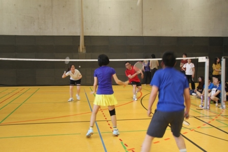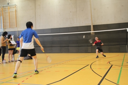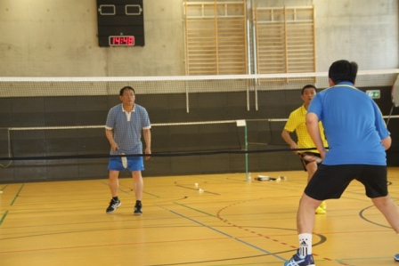 比赛开始后,各队选手马上进入竞技状态。赛场上是热火朝天,参赛选手们沉着冷静,身手矫捷,时而以巧破千斤,时而大力扣杀,场面精彩刺激。看台上更是喜乐 融融,家属、观众为自己的队伍欢呼喝彩。中午时分,700个有荤有素的大包子准时到达,啦啦队们笑容满面的排队等着领取美食。比赛精彩、包子好吃,当天上 午七支参赛队伍进行了激烈的角逐,最终中国工商银行法兰克福分行、华为技术德国有限公司、混合一队、混合二队分别以各小组前两名的成绩出现。下午的淘汰赛 和决赛更是精彩万分,最后决定冠亚军的压轴好戏居然是女子双打,全场所有观众不约而同的围在了8号场地一起观看4位女选手激烈的博弈。比分一直是你追我 赶、不相上下经常只是一分之差,当第三局比赛打到11比10分时各队的教练还居然例外叫了暂停,分别对各自队员进行了现场技术指导。现场气氛异常紧张,选 手们每一拍的挥动都紧紧地牵动着观众们的心。