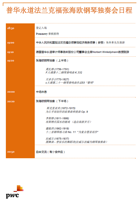 2016年9月14日(周三)法兰克福普华永道大楼举办旅德华人青年钢琴家张海欧钢琴独奏音乐会,邀请各会员企业参加。