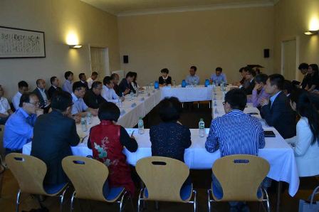 8月17日,王顺卿总领事在总领馆经商室与法兰克福中资企业协会座谈。经商领事朱伟革主持座谈会,国航欧洲地区总经理田玉岐女士代表中企协会致辞。